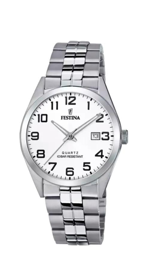 Orologio Festina da uomo della linea classics, cassa in acciaio inossidabile con un diametro di 40 mm e uno spessore di 9,1 mm. Il vetro è minerale mentre il quadrante è di colore bianco. Il movimento è al quarzo con funzione di solo tempo. La resistenza all'acqua è 10 bar.