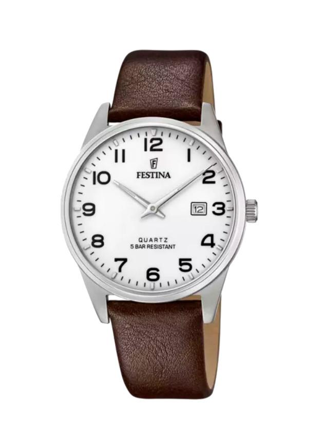 Orologio Festina da uomo della linea classics, cassa in acciaio inossidabile con un diametro di 39,3 mm e uno spessore di 8,25 mm. Il vetro è minerale mentre il quadrante è di colore bianco. Il movimento è al quarzo con funzione di solo tempo. La resistenza all'acqua è 5 bar.
