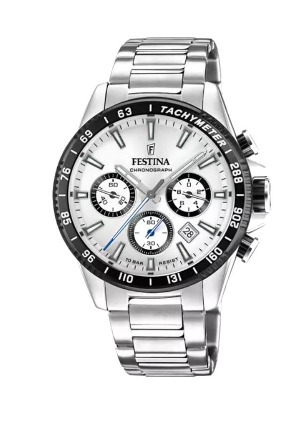 Orologio Festina da uomo, cassa in acciaio inossidabile con un diametro di 45 mm e uno spessore di 11,8 mm. Il vetro è minerale mentre il quadrante è di colore argento. Il movimento è al quarzo con funzione di orario, datario e cronografo. La resistenza all'acqua è 10 bar.