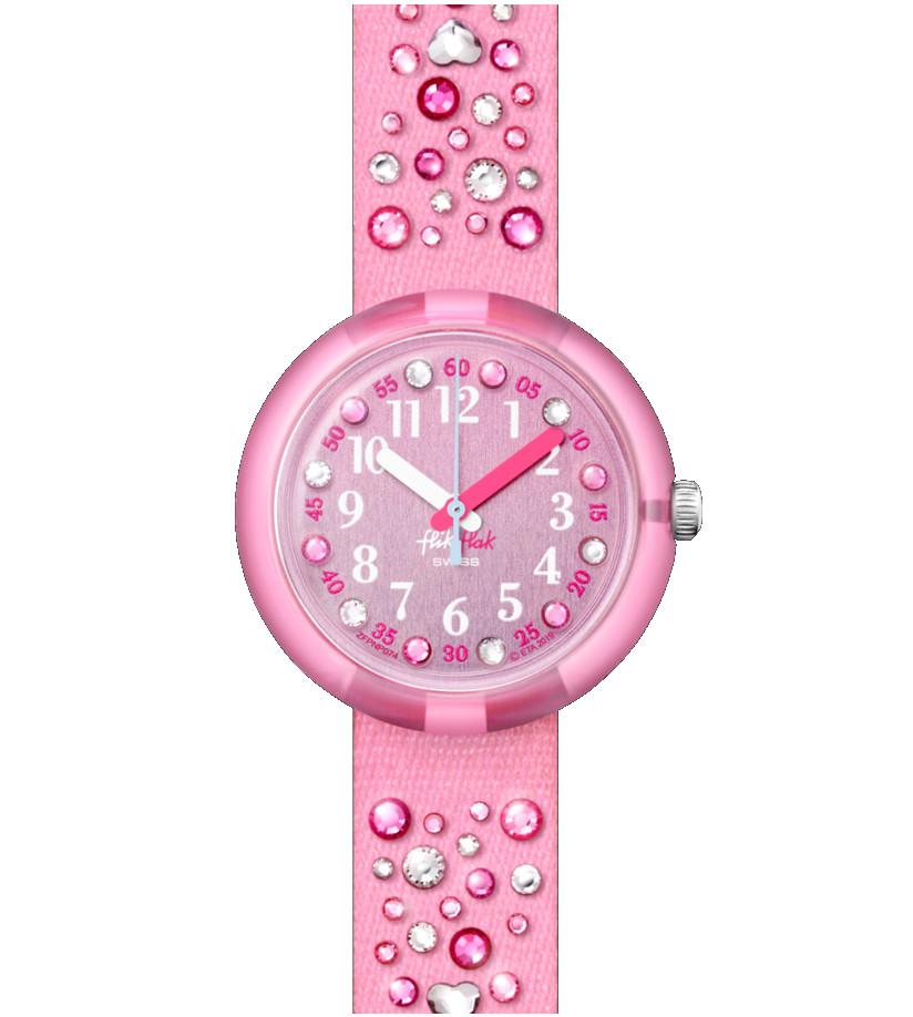 Orologio Flik Flak MILLEFEUX (FPNP074). Super stiloso, con il cinturino rosa tempestato di splendenti cristalli Swarovski® e la cassa in plastica trasparente rosa, è un regalo per bambini dal successo assicurato.