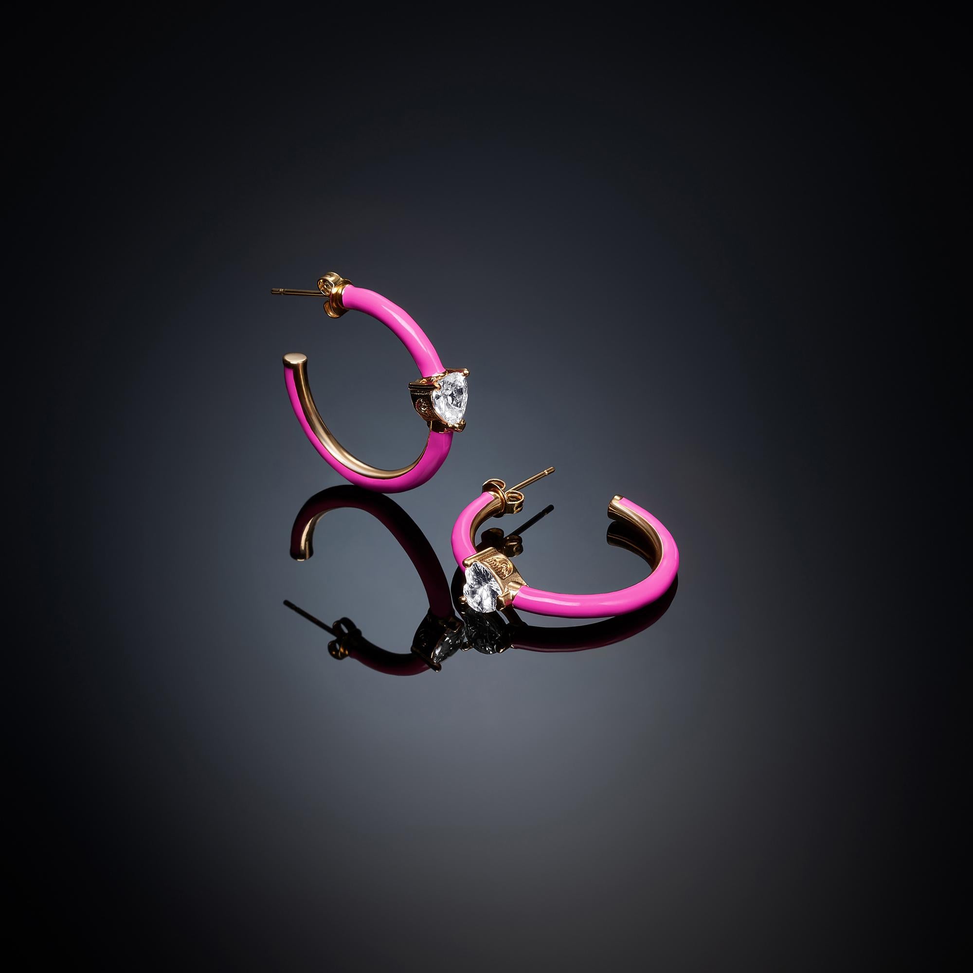 Orecchini Chiara Ferragni Brand collezione Love Parade, realizzati in metallo placcato in oro 18 kt, smalto di colore rosa e uno zircone taglio cuore trasparente.