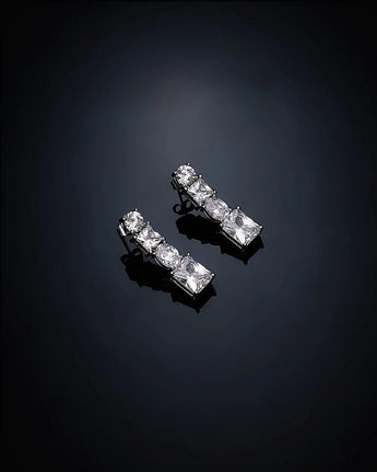 Orecchini Chiara Ferragni della collezione Princess, placcati al rodio con pietre bianche taglio quadrato e ovale. Chiusura a farfallina.