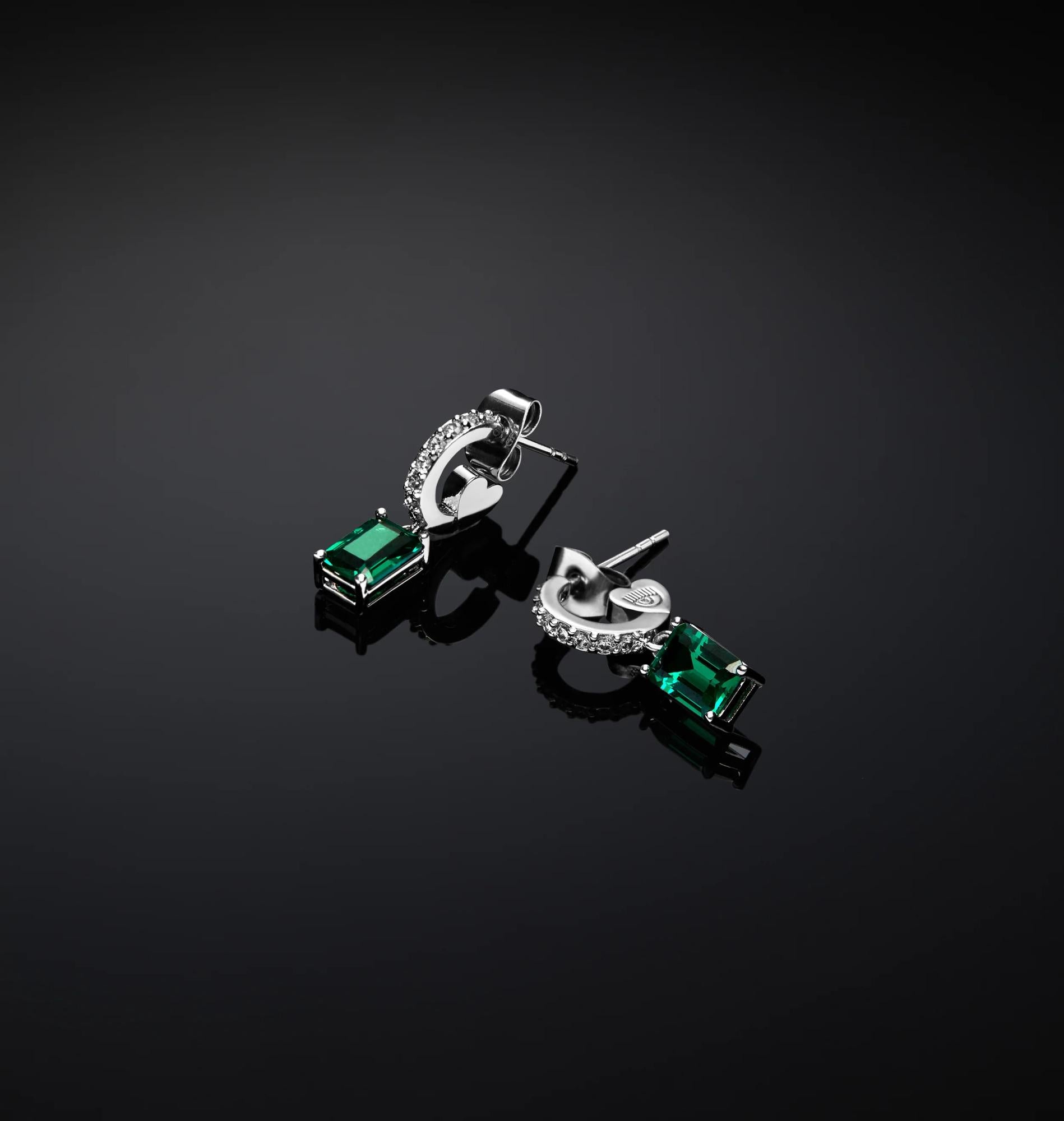 Orecchini a cerchio placcati argento con pavé di zirconi e pendente verde smeraldo.