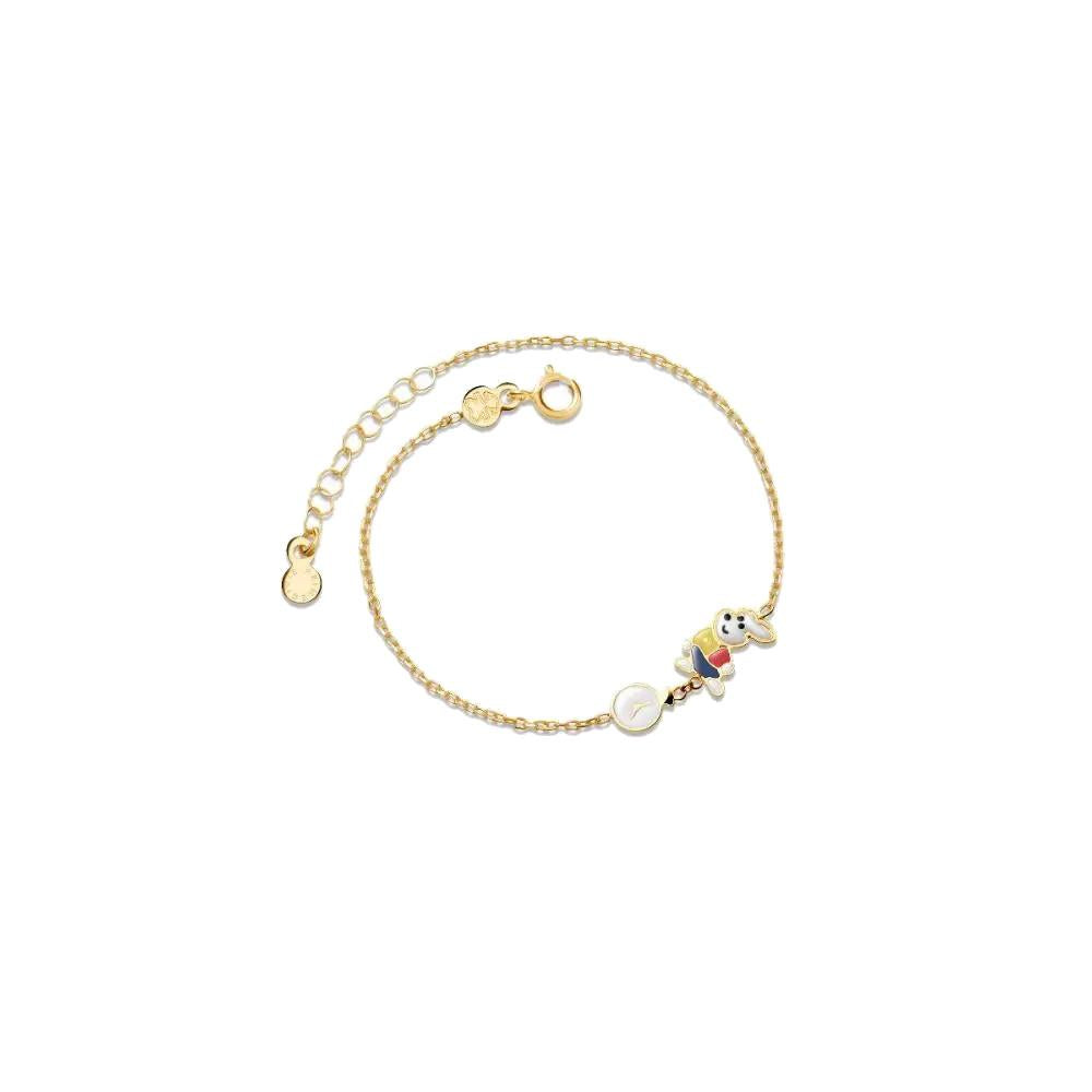 Bracciale le bebé realizzato in oro giallo 9Kt e smalto con Bianconiglio e orologio, della linea prime gioie (le fiabe). La lunghezza è di 16 cm con la regolazione fino a 14cm, chiusura con moschettone.