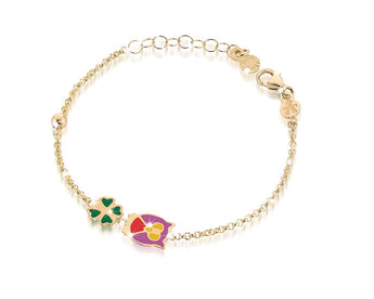Bracciale per bambini in oro giallo 9kt con disegnato quadrifoglio e civetta in smalto colorato. La lunghezza è regolabile da 13cm a 15cm.
