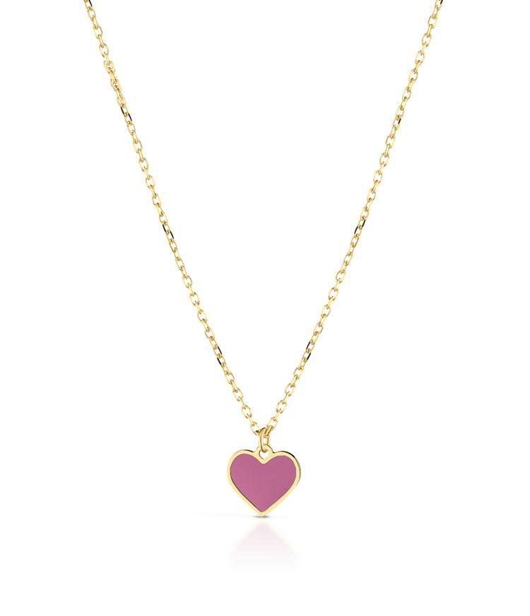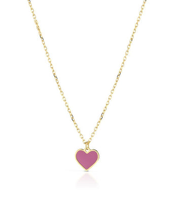Collana in oro giallo 9kt con ciondolo a forma di cuore in smalto rosa. La collana è regolabile in lunghezza da 38cm a 40cm.