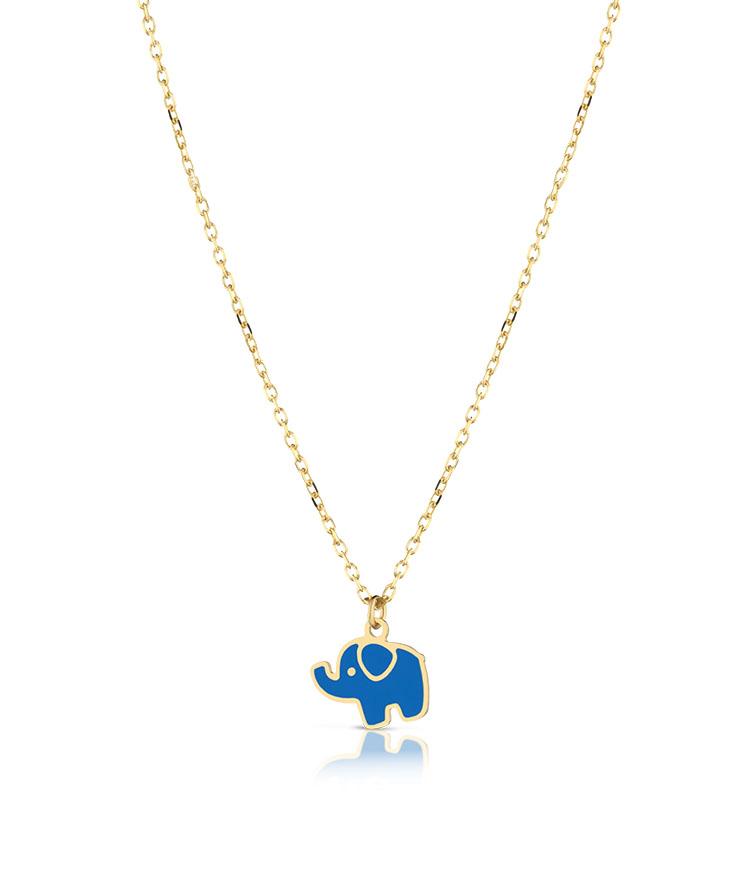 Collana in oro giallo 9kt con ciondolo a forma di elefantino in smalto blu. La collana è regolabile in lunghezza da 38cm a 40cm.