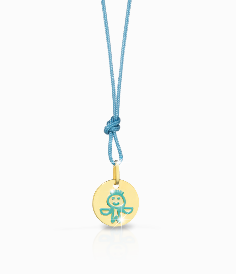 Pendente in oro giallo 9kt con disegno della bilancia in smalto celeste. Collana a cordino in tessuto regolabile in lunghezza.