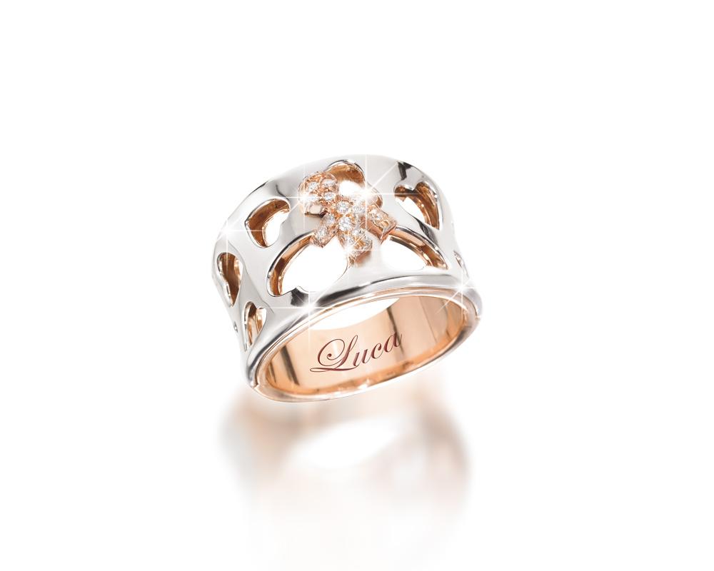 Anello a fascia realizzato in oro bianco esternamente e in oro rosa all'interno. Lungo tutta la fascia troviamo dei cuori a traforo. Sopra, al centro dell'anello c'è il ciondolo a forma di maschietto in oro rosa e diamanti. La caratura totale è di 0,12 ct, colore G, qualità VS.