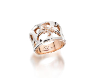 Anello a fascia rastremata con gambo in oro rosa e fascia a vista in oro bianco cuori traforati maschietto in oro rosa e pavé di brillanti