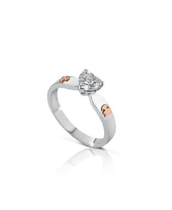 Anello, modello solitario, realizzato in oro bianco 18kt e diamanti. La parte superiore modellata a cuore contiene una caratura di brillanti paria a 0,17 ct colore G e qualità VS. Ai lati del cuore troviamo un maschietto e una femminuccia in oro rosa.