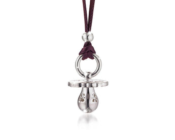 Pendente a forma di ciuccio, realizzato in argento 925. Questo inconfondibile ciondolo è dedicato ad uno dei momenti più belli della vita, l'attesa. Nella parte centrale del ciuccio troviamo le sagome traforate dei bambini. Accompagnato da un cordino in nastro e un distanziatore in argento.