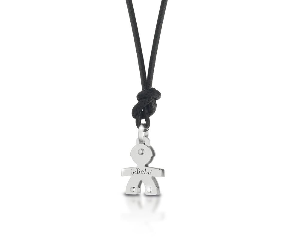 Accompagnata da un cordino nero fermato da un distanziatore in oro bianco.