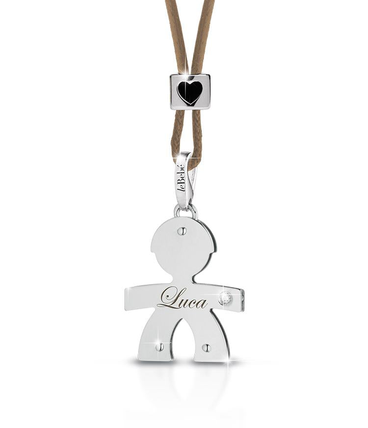 Ciondolo in Oro bianco a forma di maschietto. Realizzato con due lastre sovrapposte e incastrate fra loro con dei perni in oro. Un Diamantino incastonato nella mano rende il pendente ancora più brillante e prezioso.