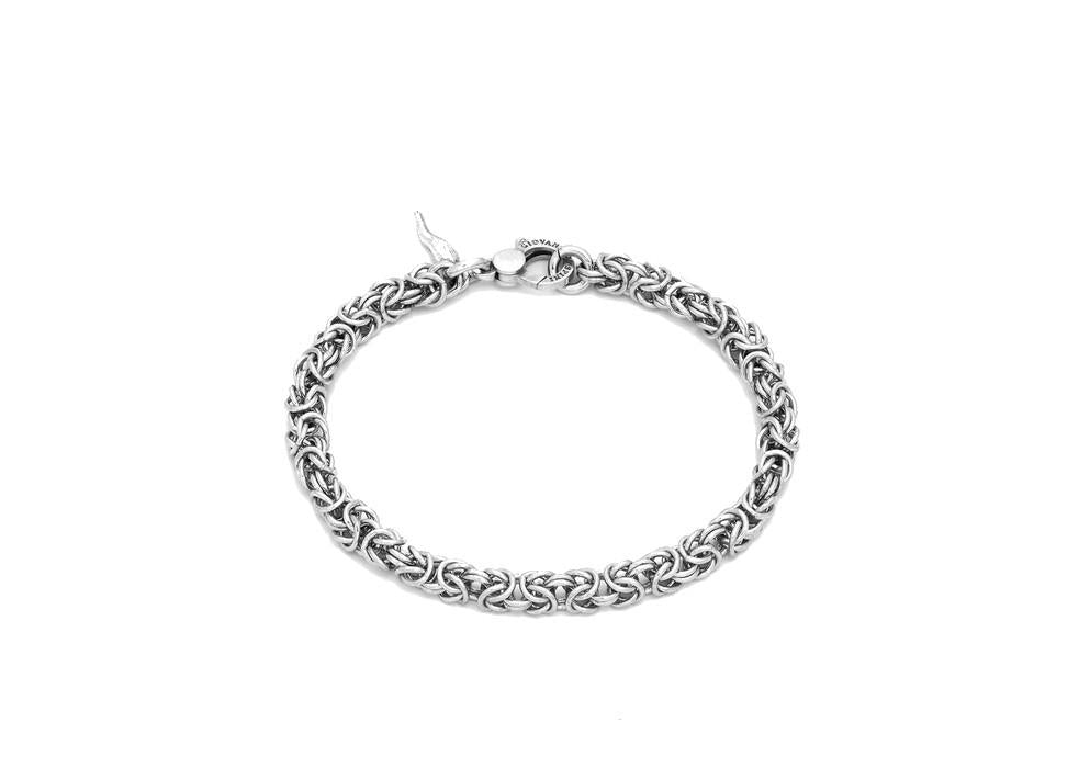 Una catena iconica, che ha segnato la storia della gioielleria, si trasforma in un raffinato bracciale in argento. E' la maglia bizantina in versione mini, lavorata artigianalmente. Con il suo particolarissimo ed elegante intreccio, rappresenta da sempre uno dei best seller della Maison Giovanni Raspini. Un gioiello versatile che si presta ad un indosso sia maschile che femminile.
