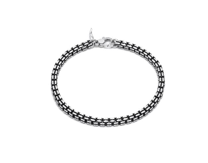 Bracciale Giovanni Raspini da uomo, realizzato in argento 925 con lavorazione brunita. La lunghezza del bracciale è 20,5 cm. La chiusura è a moschettone.