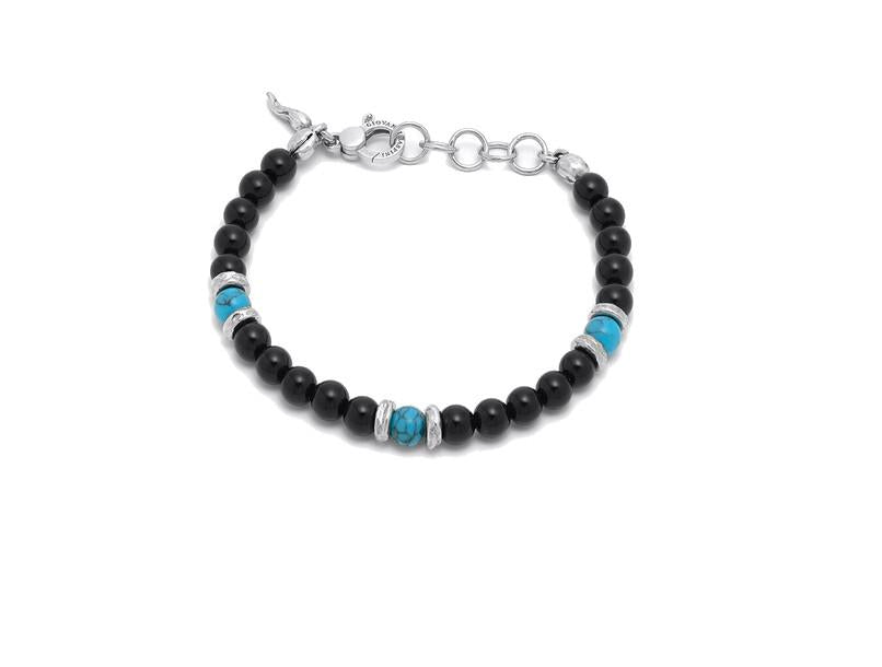 Bracciale Giovanni Raspini, reaalizzato in argento 925. Le pietre sono onice e turchese. La lunghezza del bracciale è 22 cm con chiusura a moschettone più catenella di regolazione.