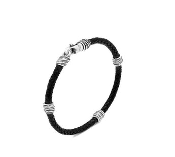 Bracciale Raspini da uomo, realizzato con quoio intrecciato e bead in argento con lavorazione a fili. Lunghezza del bracciale 21 cm. Chiusura a moschettone.