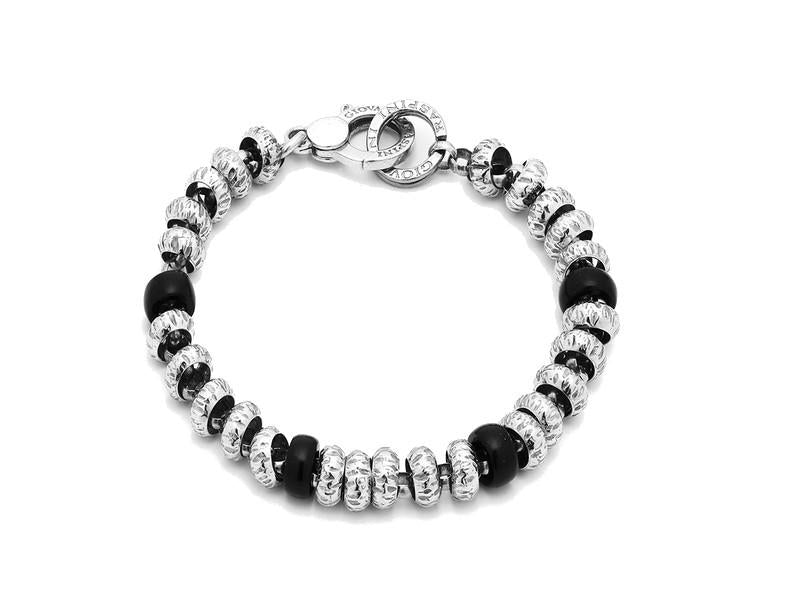 Bracciale Raspini realizzato in argento 925 con una lunghezza di 20 Cm, catena rolò con bead argento e neri. La chiusura è a moschettone.