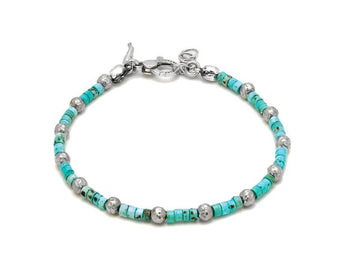 Bracciale Raspini da uomo in argento 925 e Howlite color turchese. La lunghezza è 22Cm. La chiusura è a moschettone con maglie di regolazione finale.