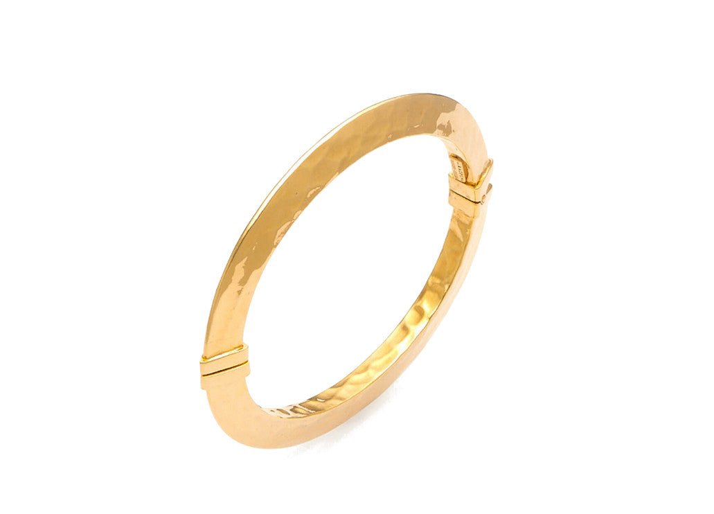 La finitura dorata dona calore e brillantezza, esaltando la semplicità delle linee. Il profilo ovale e la pratica apertura con molla rendono questo bracciale facile da indossare ogni giorno, perfetto da solo o abbinato ad altri pezzi per un look ancora più personale.
