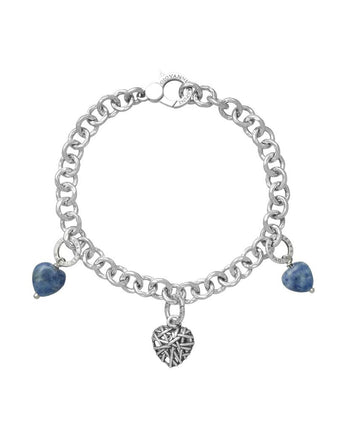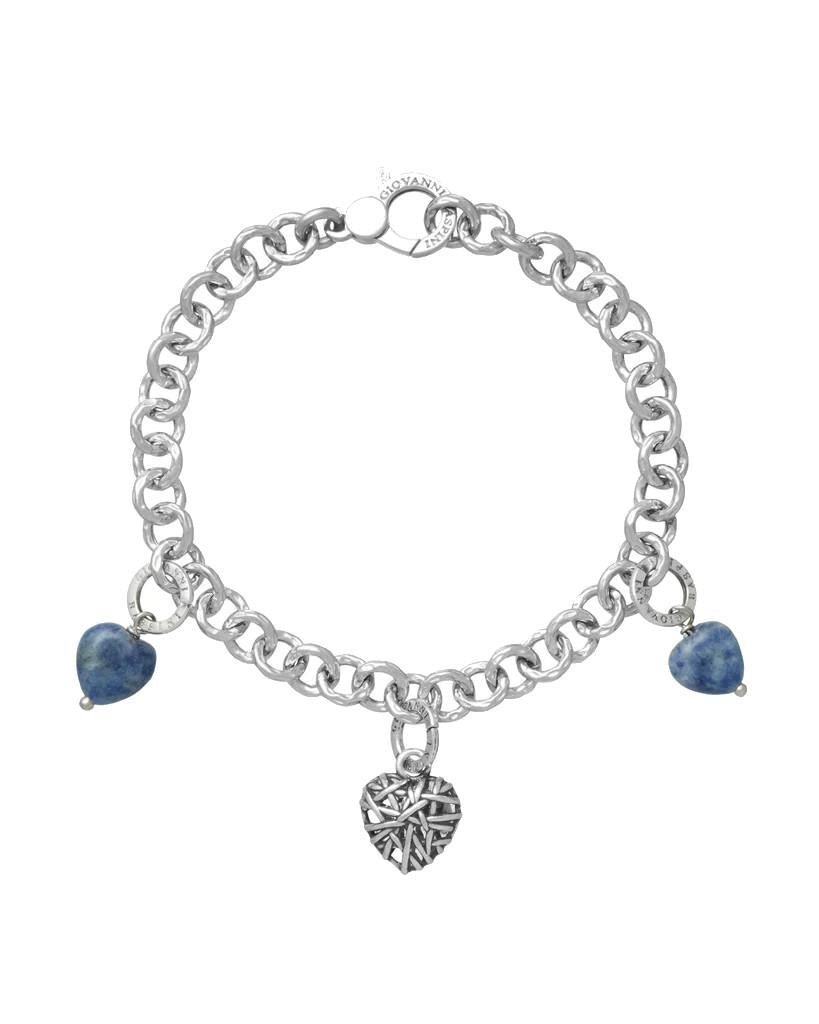 Bracciale Giovanni Raspini, realizzato in argento 925 con tre pendenti a forma di cuore due dei quali sono in sodalite. La chiusura è a moschettone.