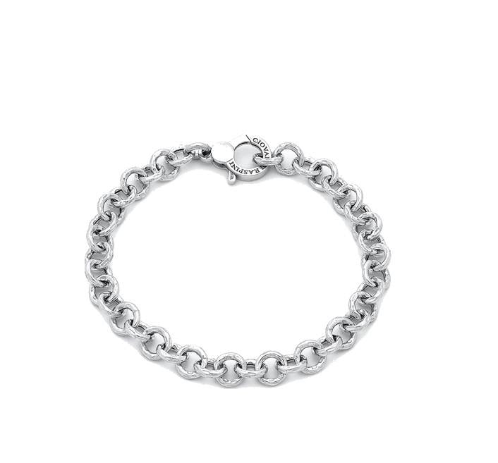 Bracciale Giovanni Raspini maglia martellata, realizzato in argento 925. La lunghezza del bracciale è 20cm con possibilità di regolazione. La chiusura è a moschettone.