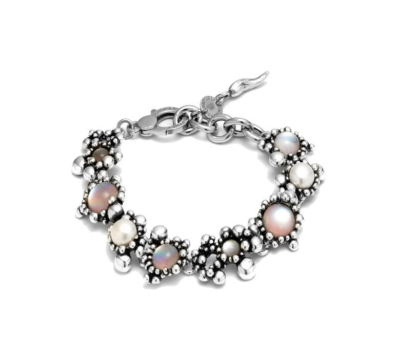 Bracciale Giovanni Raspini, realizzato in argento 925 e perle con lavorazione brunita. Lunghezza cm 20. Chiusura a moschettone con maglie di regolazione.