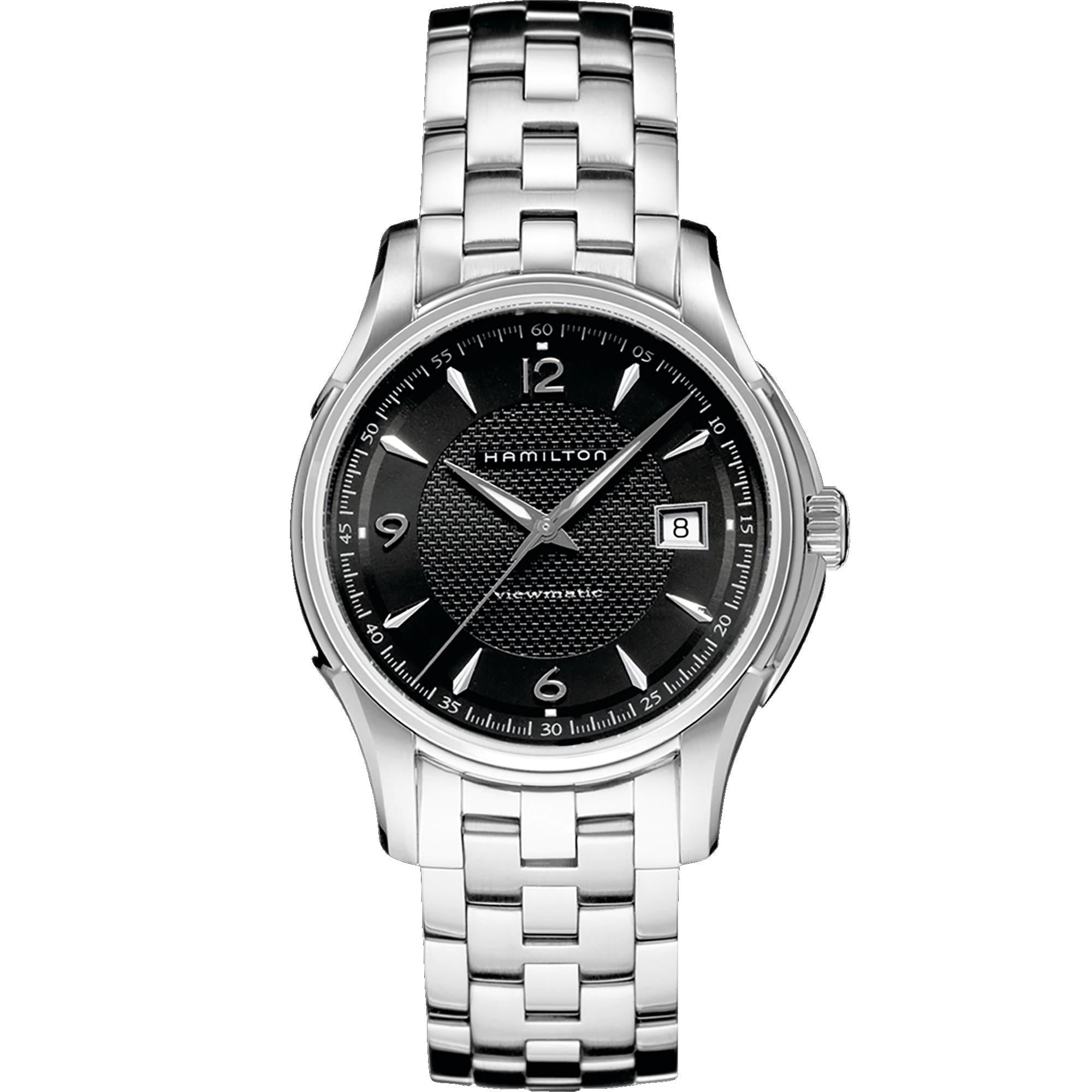 Orologio Hamilton da uomo Jazzmaster Viewmatic Auto, cassa in acciaio inossidabile con un diametro di 40 mm, quadrante di colore nero con indici applicati, vetro in zaffiro antigraffio. Il meccanismo è automatico calibro H-10 a tre sfere con data e riserva di carica superiore di 80 ore, l'H-10 presenta elaborati motivi colimaçon e perlati a contrasto per i modelli American Classic e superfici pulite per gli orologi da pilota. Il bracciale è in acciaio inossidabile con fibbia pieghevole. La resistenza all'acqua è di 5 bar.