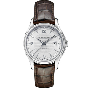 Orologio Hamilton da uomo Jazzmaster Viewmatic Auto, cassa in acciaio inossidabile con un diametro di 40 mm, quadrante di colore argento con indici applicati, vetro in zaffiro antigraffio. Il meccanismo è automatico calibro H-10 a tre sfere con data e riserva di carica superiore di 80 ore, l'H-10 presenta elaborati motivi colimaçon e perlati a contrasto per i modelli American Classic e superfici pulite per gli orologi da pilota. Il bracciale è in pelle di vitello con stampa alligatore. La resistenza all'acqua è di 5 bar.