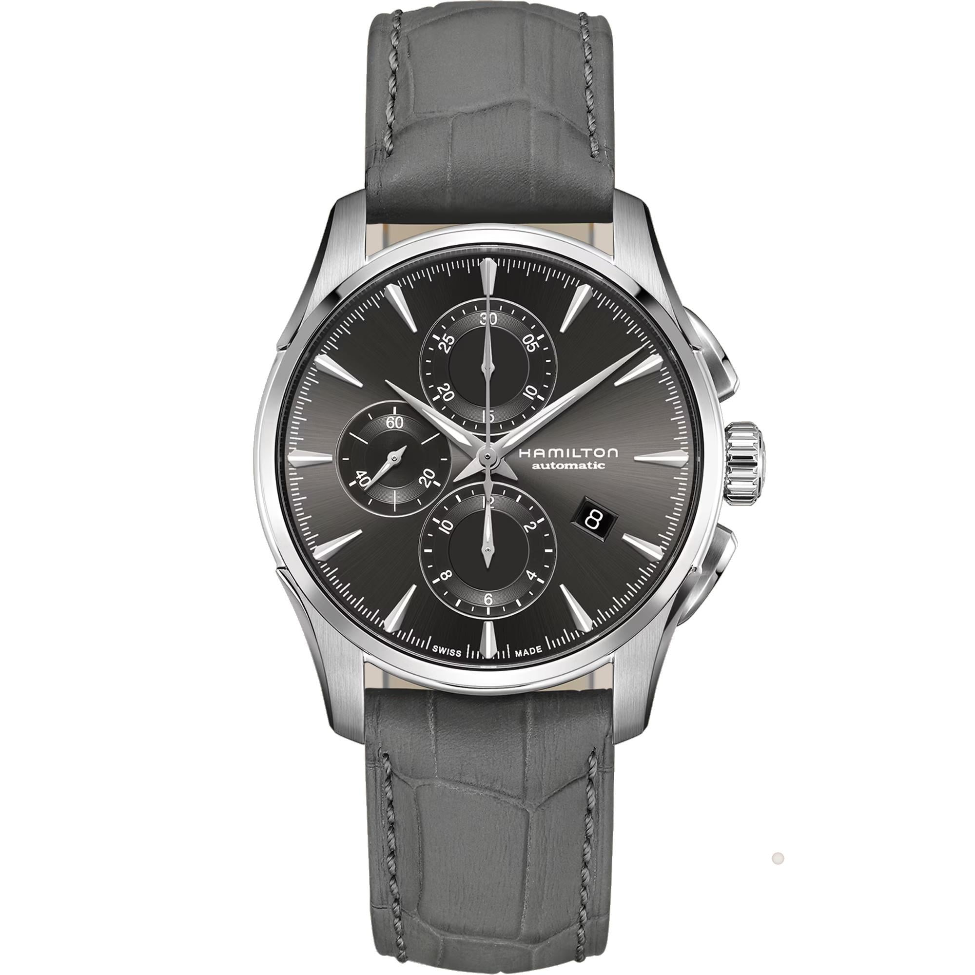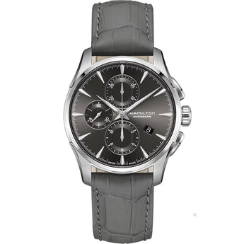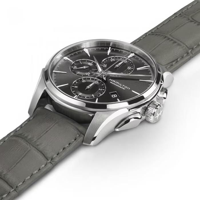Orologio Hamilton Jazzmaster, cassa in acciaio inossidabile con un diametro di 42 mm e uno spessore di 15,23 mm. Il quadrante è di colore grigio, vetro in zaffiro antigraffio. Il meccanismo è automatico calibro H-21 con una riserva di carica di 60 ore. Le funzioni sono orario, datario e cronografo. Il cinturino è in pelle con fibbia pieghevole.