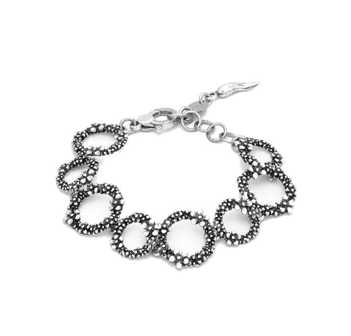 Bracciale Giovanni Raspini Millefiori, realizzato in argento 925 con lavorazione lucida e brunita. La lunghezza è 18,5 cm. Chiusura a moschettone.
