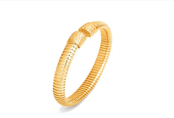 Un classico della gioielleria reinterpretato con stile contemporaneo: il bracciale rigido Tubogas in argento 925 con bagno d'oro 18 kt unisce eleganza senza tempo e design deciso. La sua struttura avvolgente si ispira alle icone del Novecento, mentre le estremità scolpite a mano con texture coccodrillo, realizzate con la tecnica della fusione a cera persa, aggiungono un tocco distintivo e grintoso.