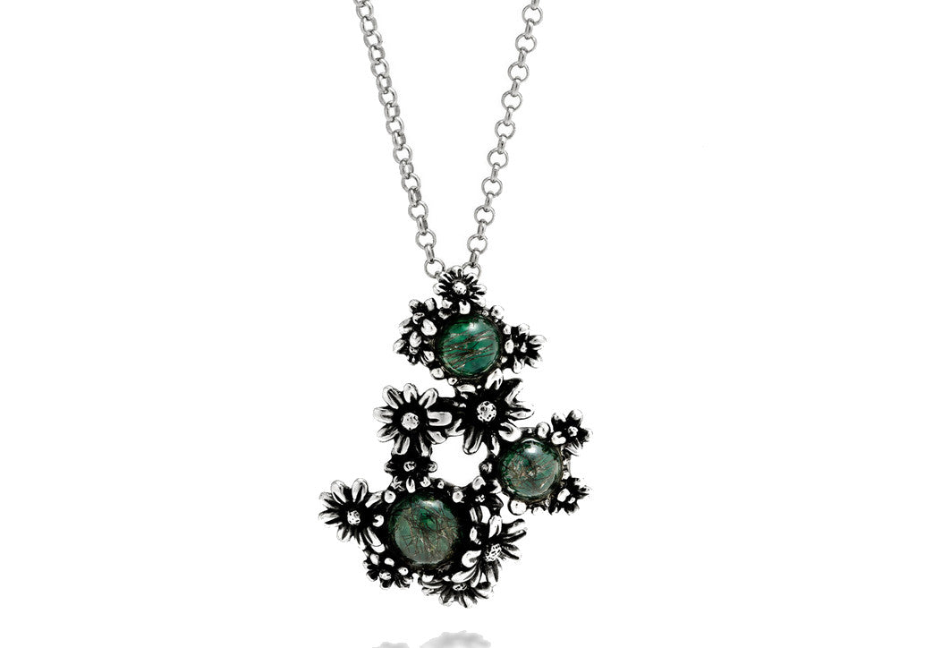 Tre gemme cabochon in agata verde, doppiate con quarzo tormalinato, brillano come gocce di rugiada su un prato fiorito, adagiandosi su un elegante decoro di micro-margherite in argento brunito. Un design raffinato e artigianale, che fonde la forza delle pietre naturali alla delicatezza dei dettagli floreali.