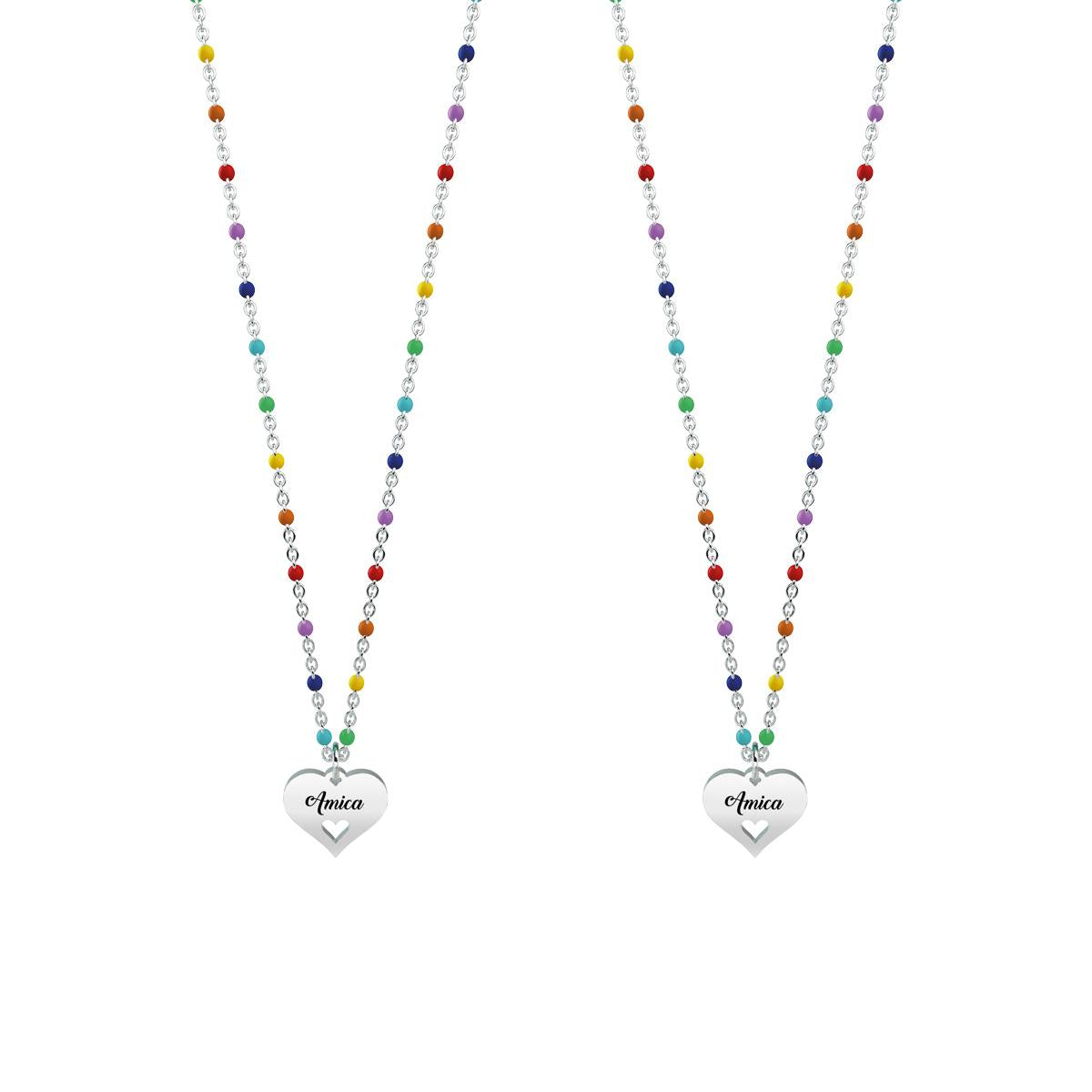 Sei l'amica che so di avere sempre accanto anche dall'altra parte del mondo.Set di due collane corte in acciaio con ciondolo a cuore e catena rolò con inserimenti in smalto multicolor. • Incisione smaltata sul ciondolo e inserimenti in smalto sulla catena • Chiusura con moschettone • Misura unica, lunghezza 44 cm • Materiale: Acciaio 316L, Smalto • Designed by Kidult in Italy