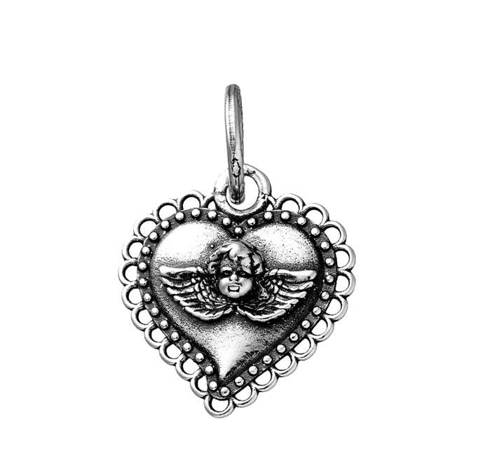 Ciondolo Giovanni Raspini cuore votivo e angelo, realizzato in argento 925 con finitura lucida e brunita. L'altezza è di 1,9 cm (esclusa la maglia di 0,9 cm).