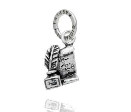 Charm Raspini in argento 925 a forma di Lettera e Calamaio. La finitura è lucida e brunita. Munito di maglia rinforzata con inciso il logo. Il ciondolo ha un peso di 3gr. e un'altezza di 1,6cm esclusa la maglia che ha un'altezza di 0,9. Fatto a mano in Italia.