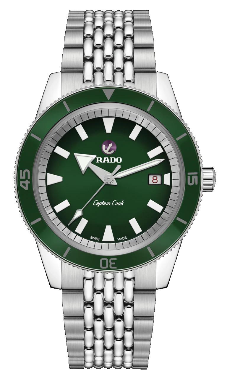 Orologio Rado Captain Cook Automatic, cassa in acciaio inossidabile con un diametro di 42 mm, il quadrante è di colore verde con indici bianchi. Il meccanismo è automatico Swiss Made con una riserva di carica di 80 ore e funzione di tempo e data. Il bracciale è in acciaio inossidabile. La resistenza all'acqua è di 20 bar.