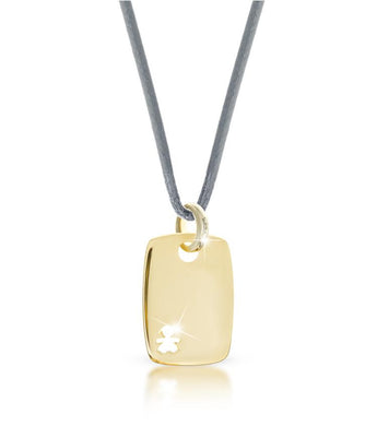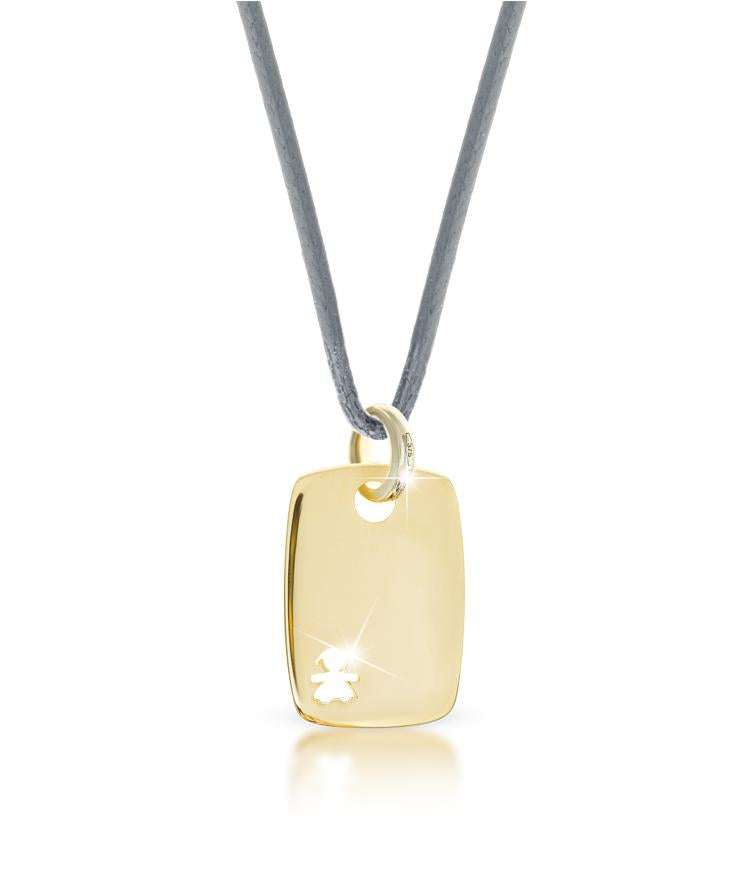 Piastrina in oro giallo 9kt. Nella piastrina troviamo la sagoma della femminuccia traforata. Il ciondolo è accompagnato dal cordino in tessuto.