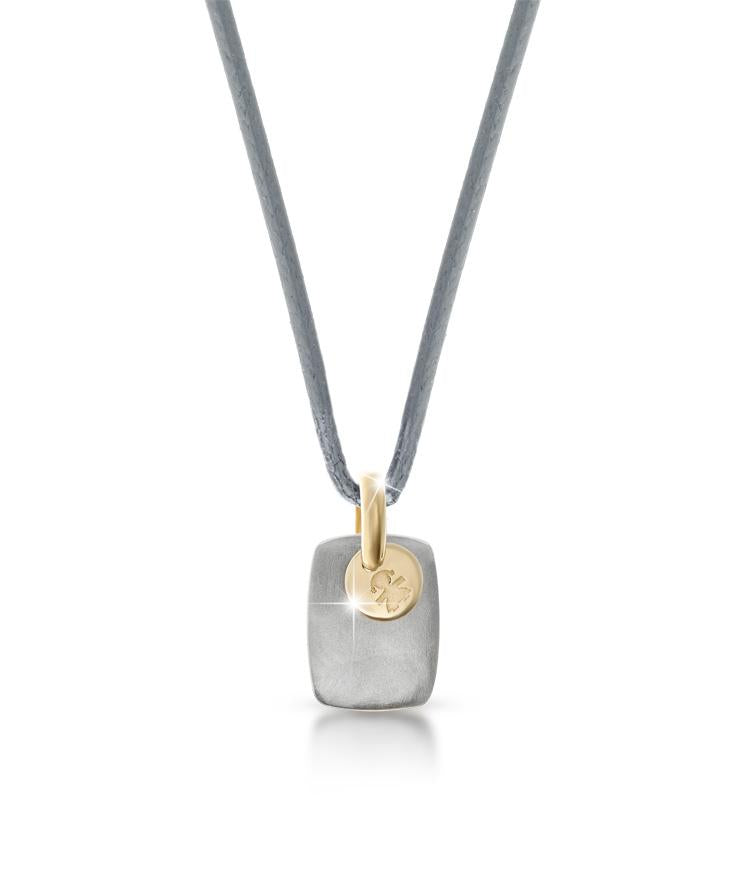 Ciondolo a forma di piastrina in tiatnio con medaglia in oro giallo 9kt dove troviamo incisa la sagoma della femminuccia.