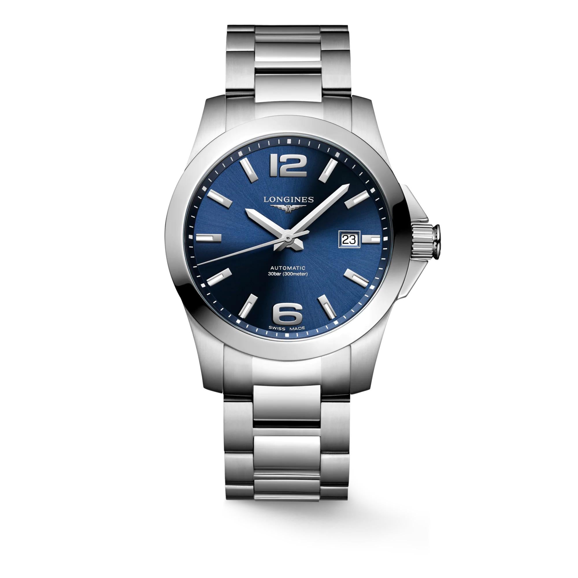 Orologio Longines Conquest, referenza L37774996, cassa in acciaio inossidabile di   forma rotonda di diametro 41mm e uno spessore di 11,70mm. Il fondello e la corona   sono a vite con una resistenza all'acqua di 30 bar. Il vetro è in zaffiro antigraffio   con trattamento antiriflesso sul lato interno. Il quadrante è di colore blu finitura a raggi di sole, numeri arabi e indici applicati, lancette colore argento lucide. Il movimento   è automatico calibro L888 con frequenza di 25'200 alternanze orarie e riserva di   carica di circa 72 ore. Le funzioni sono ore, minuti, secondi e data.