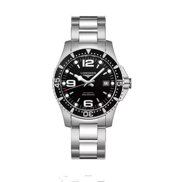Orologio Longines HydroConquest, referenza L37424566, cassa in acciaio inossidabile di forma rotonda con un diametro di 41mm e uno spessore di 11,90mm. Il vetro è in zaffiro antigraffio bombato con trattamento antiriflesso multistrato sul lato interno. Il fondello e la corona sono a vite con una resistenza all'acqua di 30 bar. Il quadrante è di colore nero con lavorazione a raggi di sole, numeri arabi e indici applicati, lancette argentate lucide. Il meccanismo è automatico calibro L888 con frequenza di 25'200 alternanze orarie e riserva di carica di circa 72 ore, le funzioni sono di ore, minuti, secondi e data.