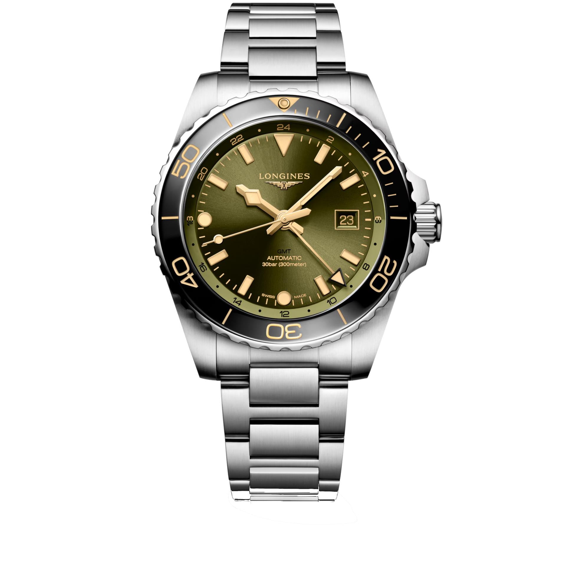 L'Hydroconquest GMT da 43 mm con quadrante verde è animato dal calibro Longines GMT L844.5 e dispone di una precisione estrema e una riserva di carica di 72 ore. Con un quadrante finito a sole e una lunetta in ceramica nera, è resistente fino a 300m e dotato di corona e fondello a vite. Bracciale in acciaio incluso.