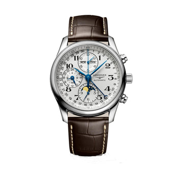 Orologio Longines MASTER COLLECTION, con una forma rotonda e materiale in acciaio inossidabile. Vetro antigraffio in zaffiro, fondello trasparente in vetro zaffiro 40.00 mm di diametro, 21 mm di distanza tra le anse e uno spessore di 14.30 mm. Impermeabile fino a 3 bar. Peso di 93.7 g e un colore del quadrante argento grains d'orge. Lancette in acciaio azzurrato, numeri arabi dipinti e un movimento meccanico a carica automatica con frequenza di 28'800 alternanze orarie e riserva di carica di circa 66 ore. Dotato funzione delle ore, minuti, secondi e indicatore delle 24 ore a ore 9. Indicazione della data mediante lancetta centrale a mezzaluna. Indicatore delle fasi lunari a ore 6.