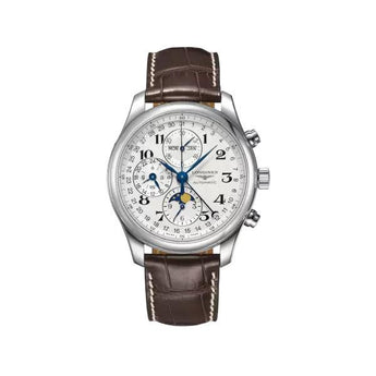 Orologio Longines Master Collection, referenza L27734783, cassa in acciaio inossidabile di forma rotonda con un diametro di 42mm e uno spessore di 14,20mm. Il vetro è in zaffiro antigraffio. Il fondello è a vista con vetro zaffiro antigraffio. L'impermeabilità è 3 bar. Il quadrante è di colore grigio con lancette in acciaio azzurrato e numeri arabi dipinti. Il meccanismo calibro L687 è automatico cronografo con movimento ruota a colonne, con funzione ore, minuti, piccoli secondi con indicatore delle 24 ore a ore 9. Indicazione della data mediante lancetta centrale a mezzaluna. Indicatore delle fasi lunari a ore 6. Meccanismo del cronografo: lancetta centrale dei 60 secondi, indicazione della fase lunare con contatore delle 12 ore a ore 6 e contatore dei 30 minuti con indicazione del giorno e della data a ore 12.