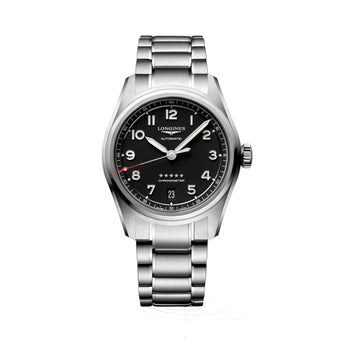 Orologio Longines Spirit, cassa in acciaio inossidabile con un diametro di 37 mm e uno spessore di 11,70 mm. Il quadrante è nero con numeri arabi applicati. Il meccanismo è automatico calibro L888.4 con funzione di solo tempo e datario. La resistenza all'acqua è di 10 bar. Il bracciale è in acciaio inossidabile con chiusura déployante a tripla sicurezza e meccanismo di apertura a pressione.
