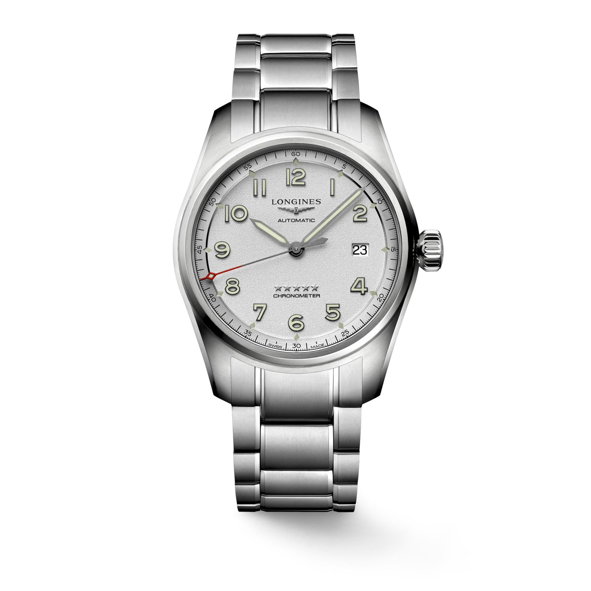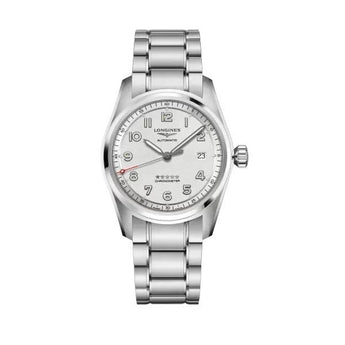 Orologio Longines Spirit, referenza L38104736, cassa in acciaio inossidabile di forma rotonda con un diametro di 40mm e uno spessore di 12,20mm, la corona è a vite con una resistenza all'acqua di 10 bar, il vetro è in zaffiro antigraffio con trattamento antiriflesso multistrato su entrambi i lati. Il quadrante è colore argento con numeri arabi applicati e lancette nere. Il movimento è automatico calibro L888.4 con frequenza di 25'200 alternanze orarie e riserva di carica di circa 72 ore, bilanciere-spirale in silicio monocristallino con funzione di ore, minuti, secondi e data. Cronometro certificato COSC.