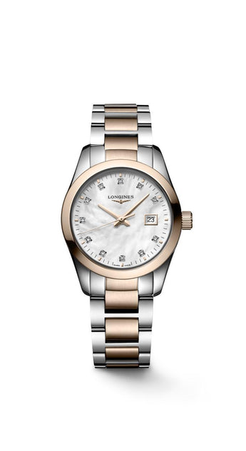 Orologio Longines Conquest Classic, referenza L22863877, cassa in acciaio inossidabile e rivestimento in PVD rosso con diamtro di 29,50mm e uno spessore di 8,70. Il vetro è in zaffiro antigraffio bombato con trattamento antiriflesso multistrato sul lato interno. La resistenza all'acqua è di 5 bar. Il quadrante è in madreperla bianco e gli indici con 11 diamanti Top Wesselton VS-SI incastonati, per un totale di 0.055 carati. Il movimento è al quarzo calibro L152 con funzione di ore, minuti, secondi e data.