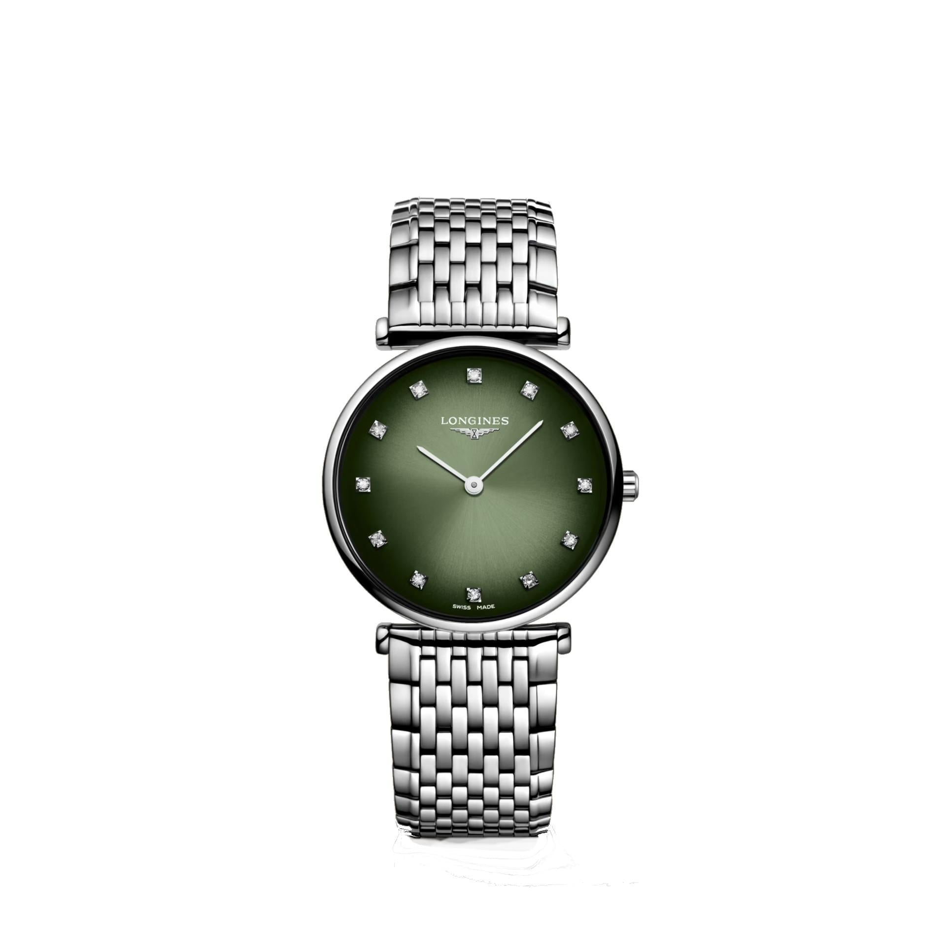L'orologio da donna Longines LA GRANDE CLASSIQUE DE LONGINES è un gioiello di precisione. Ha un quadrante rotondo in acciaio inossidabile di 29 mm con 12 diamanti Top Wesselton VS-SI, per un totale di 0.081 carati, e lancette argentate lucide. È resistente fino a 3 bar, con chiusura déployante a tripla sicurezza e meccanismo di apertura a pressione. Un omaggio all'eleganza classica e duratura.
