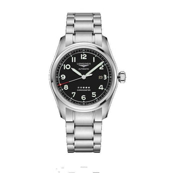Orologio Longines Spirit, referenza L38114536, cassa in acciaio inossidabile con un diametro di 42mm e uno spessore di 12,20mm, quadrante di colore nero con numeri arabi, vetro zaffiro antigraffio con trattamento antiriflesso. Il meccanismo calibro L888.4 è a carica automatica con 25200 alternanze orarie e una riserva di carica di circa 72 ore.